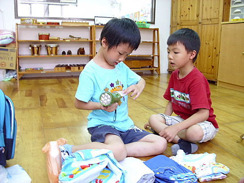 編按:今年的畢業旅行由於大班的幼兒都學會了騎自行車,我們就決定開車到龍潭三坑來一趟自行車之旅。其中全程2公里多,處在半山腰的大圳自行車道是我們選擇的主要路段。沿途花、樹遍佈,綠意盎然,在車少人稀、安全無虞的情況下,孩子可以毫無顧忌的騎著車子來回奔馳。在中午休息的時段,孩子在涼亭附近的水漥處撈小蝦,隨後在當地景點「紅橋」上釣魚,這些都是此趟旅程中的特別插曲。傍晚,孩子回到園裡,又開始了他們期待已久的喜兒傳統---體驗在沒有親人的陪伴下,和同學一起進用晚餐、玩遊戲,最後夜宿喜兒